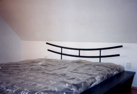 a už jsme se dostali do ložnice: naše nová postel, tady ještě nepoužitá, ale to teď už neplatí. tady prohlídka končí a další doufám už nebude. jeden barák za život by mohl stačit.